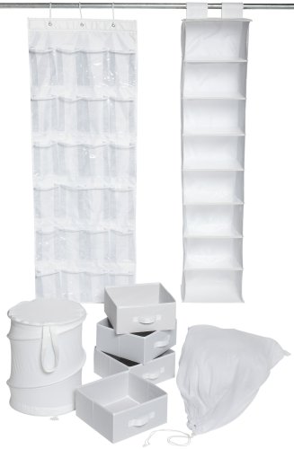 This eight piece room and laundry organizer is the perfect mix for all you organizational needs. With a pop-up hamper with a spiral steel frame for maximum support and a large capacity mesh laundry bag with locking drawstring, your laundry needs are taken care of! The 12 pair over the door shoe rack keeps shoes organized and out of sight to maximize your storage space. Offering maximum storage capacity while taking up a minimum amount of space, the 8 piece room and laundry organizer also contains 2 versatile storage drawers which can be used as stand-alone units or can be combined with the deluxe 8 shelf closet organizer which holds anything from bulky sweaters to belts, ties and other accessories in the spacious shelves. The eight items included in this package are: 1 over the door 12 pair shoe rack, 1 mesh laundry bag, 1 medium mesh pop-up hamper, 2 sets of storage drawers and an 8 shelf hanging organizer. Color: White.